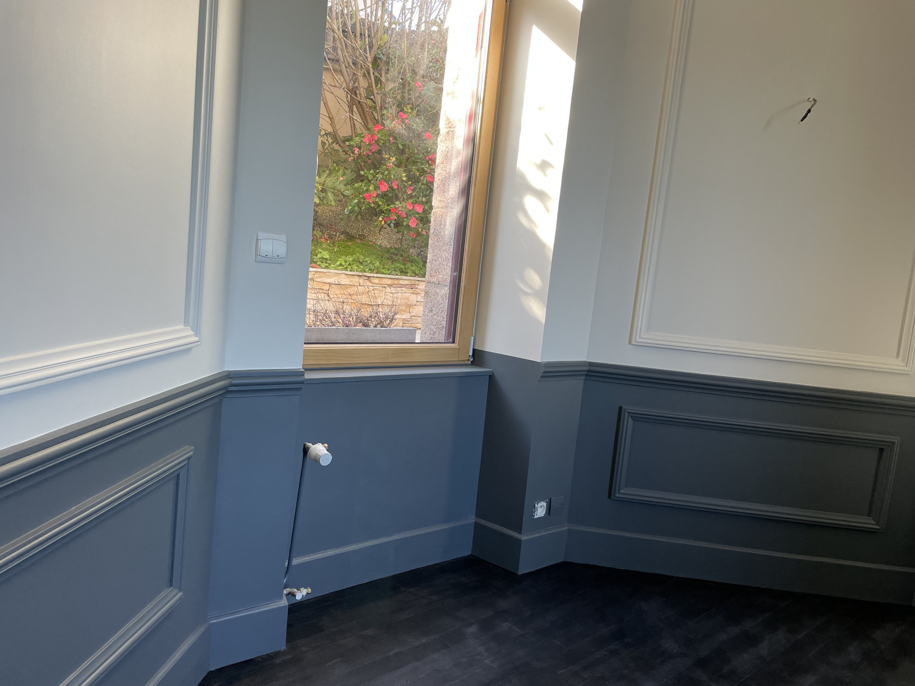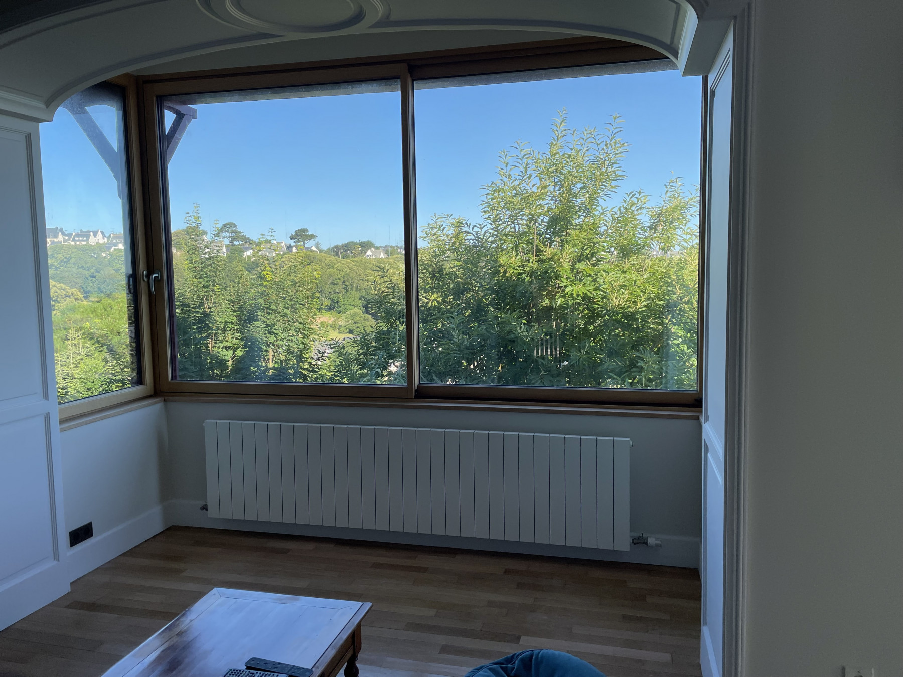 Rénovation d'une belle maison sur Perros Guirec avec moulure de plâtre en staff et vitrification des sols.